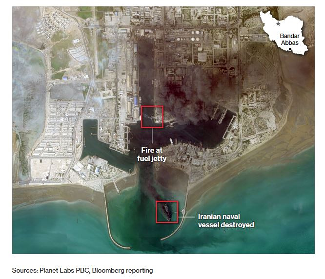 Δύο ημέρες μετά την επίθεση, τουλάχιστον ένα πολεμικό πλοίο και γειτονικές εγκαταστάσεις ανεφοδιασμού καυσίμων υπέστησαν ζημιές σε μια ιρανική ναυτική βάση στο λιμάνι Μπαντάρ Αμπάς του Περσικού Κόλπου.