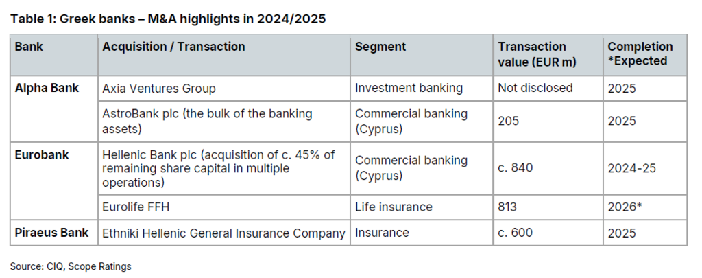Παράλληλα, οι εξαγορές και συγχωνεύσεις αναμένεται να ενισχύσουν τα επιχειρηματικά μοντέλα των τραπεζών, με πρόσφατες συμφωνίες σε Κύπρο, bancassurance και εξειδικευμένη χρηματοδότηση στην Ελλάδα να δείχνουν μια νέα στρατηγική κατεύθυνση προς μεγαλύτερη διαφοροποίηση δραστηριοτήτων.