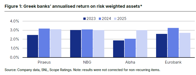 Ο οίκος εκτιμά ότι η μέση απόδοση επί των σταθμισμένων στοιχείων ενεργητικού των τεσσάρων συστημικών τραπεζών, Alpha Bank, Eurobank, Εθνική και Πειραιώς θα αυξηθεί οριακά στο 3% το 2026, από 2,9% το 2025, καθώς η άνοδος των εσόδων θα αντισταθμίσει εν μέρει την αύξηση των σταθμισμένων στοιχείων ενεργητικού λόγω υψηλότερου δανεισμού.