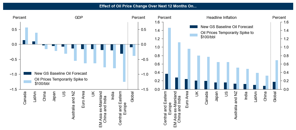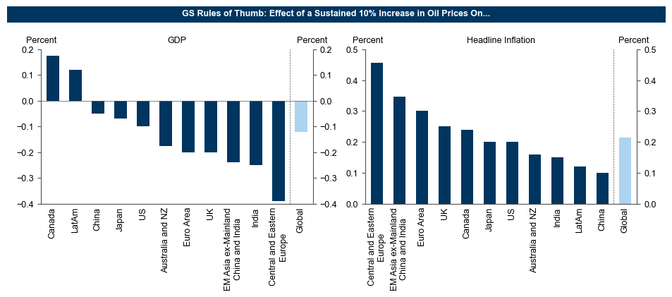 Για να εκτιμήσει τις επιπτώσεις στην παγκόσμια οικονομία, η Goldman Sachs χρησιμοποιεί επικαιροποιημένες εκτιμήσεις των ομάδων της ανά χώρα σχετικά με το πώς οι αυξήσεις στις τιμές του πετρελαίου επηρεάζουν το ΑΕΠ και τις τιμές καταναλωτή.