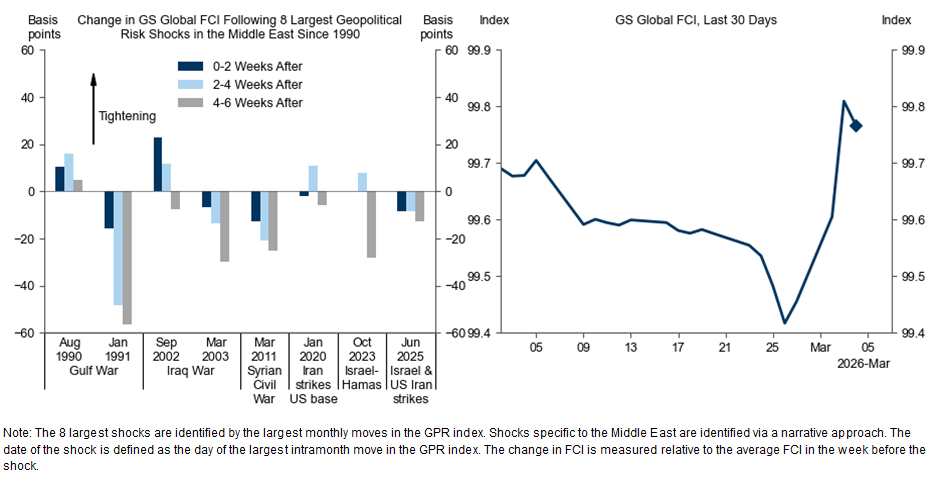 Η τράπεζα εντοπίζει επιπλέον κινδύνους για την ανάπτυξη από ενδεχόμενη αυστηροποίηση των χρηματοπιστωτικών συνθηκών. Αν και ιστορικά οι γεωπολιτικές κρίσεις στη Μέση Ανατολή δεν οδηγούσαν πάντα σε νομισματική σύσφιξη, ο παγκόσμιος δείκτης χρηματοπιστωτικών συνθηκών της Goldman Sachs έχει ήδη αυξηθεί κατά 31 μονάδες βάσης τις τελευταίες ημέρες.