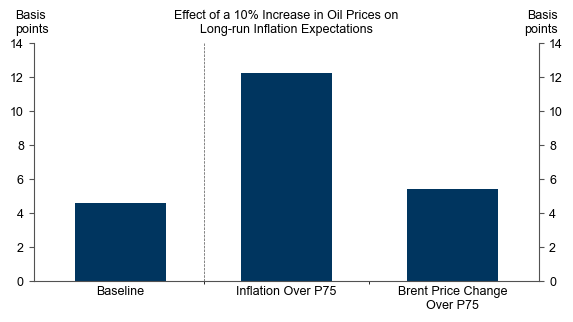 Η επίδραση στον δομικό πληθωρισμό εκτιμάται σημαντικά μικρότερη. Σύμφωνα με την αμερικανική ομάδα της τράπεζας, μια αύξηση 10% στην τιμή του πετρελαίου αυξάνει τον δομικό πληθωρισμό PCE στις ΗΠΑ κατά περίπου 4 μονάδες βάσης, ενώ η ευρωπαϊκή ομάδα εκτιμά αντίστοιχη επίδραση 3-6 μονάδων βάσης στον δομικό πληθωρισμό.