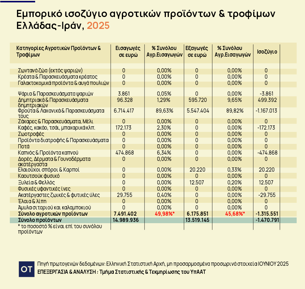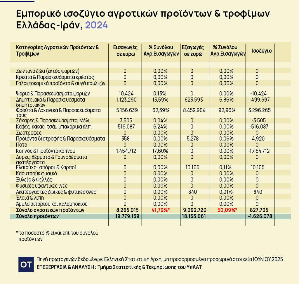 Σύμφωνα με τα προσωρινά στοιχεία της ΕΛΣΤΑΤ, το 2024 οι ελληνικές εξαγωγές αγροτικών προϊόντων προς το Ιράν ανήλθαν σε 9,09 εκατ. ευρώ, ενώ οι εισαγωγές διαμορφώθηκαν στα 8,26 εκατ. ευρώ, με θετικό εμπορικό ισοζύγιο περίπου 827 χιλιάδων ευρώ.