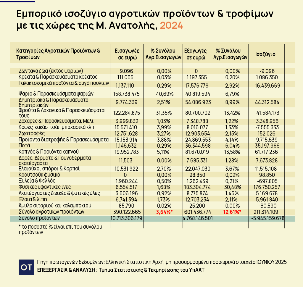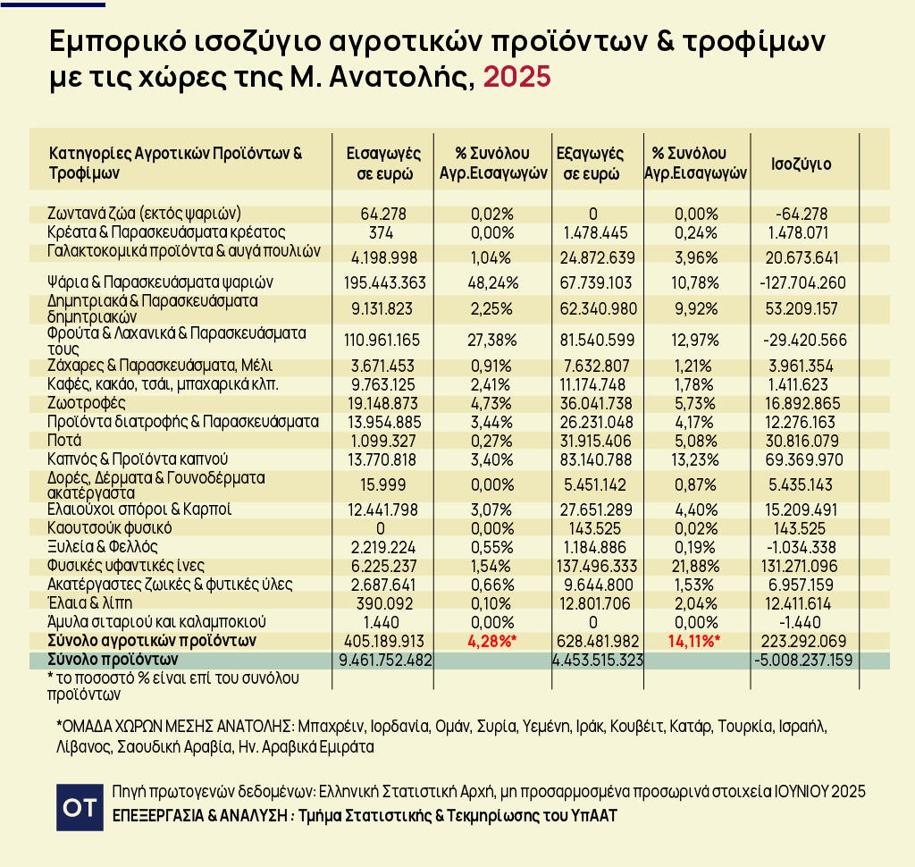 Σύμφωνα με τα στοιχεία της ΕΛΣΤΑΤ, το 2025 οι ελληνικές εξαγωγές αγροτικών προϊόντων και τροφίμων προς τις χώρες της περιοχής έφτασαν τα 628,4 εκατ. ευρώ, ενώ οι εισαγωγές διαμορφώθηκαν στα 405,1 εκατ. ευρώ, δημιουργώντας πλεόνασμα άνω των 223 εκατ. ευρώ.