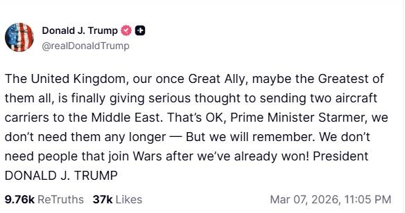 «Το Ηνωμένο Βασίλειο, ο κάποτε Μεγάλος Σύμμαχός μας, ίσως ο Μεγαλύτερος από όλους, σκέφτεται επιτέλους σοβαρά την αποστολή δύο αεροπλανοφόρων στη Μέση Ανατολή», δήλωσε ο Τραμπ.