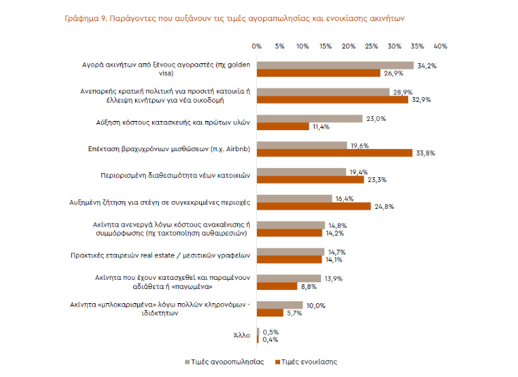 Αντίστοιχα, για τις τιμές ενοικίασης, κυρίαρχοι παράγοντες θεωρούνται η επέκταση των βραχυχρόνιων μισθώσεων (33,8%), η ανεπαρκής στεγαστική πολιτική (32,9%) και η ζήτηση από ξένους αγοραστές (26,9%). Σημαντικό εύρημα αποτελεί το γεγονός ότι περίπου οι μισοί/ές ερωτώμενοι/ες (49,4%) έχουν πραγματοποιήσει την τελευταία πενταετία κάποια συναλλαγή σχετική με ακίνητο, με τις ενοικιάσεις κατοικιών να υπερτερούν των αγοραπωλησιών.