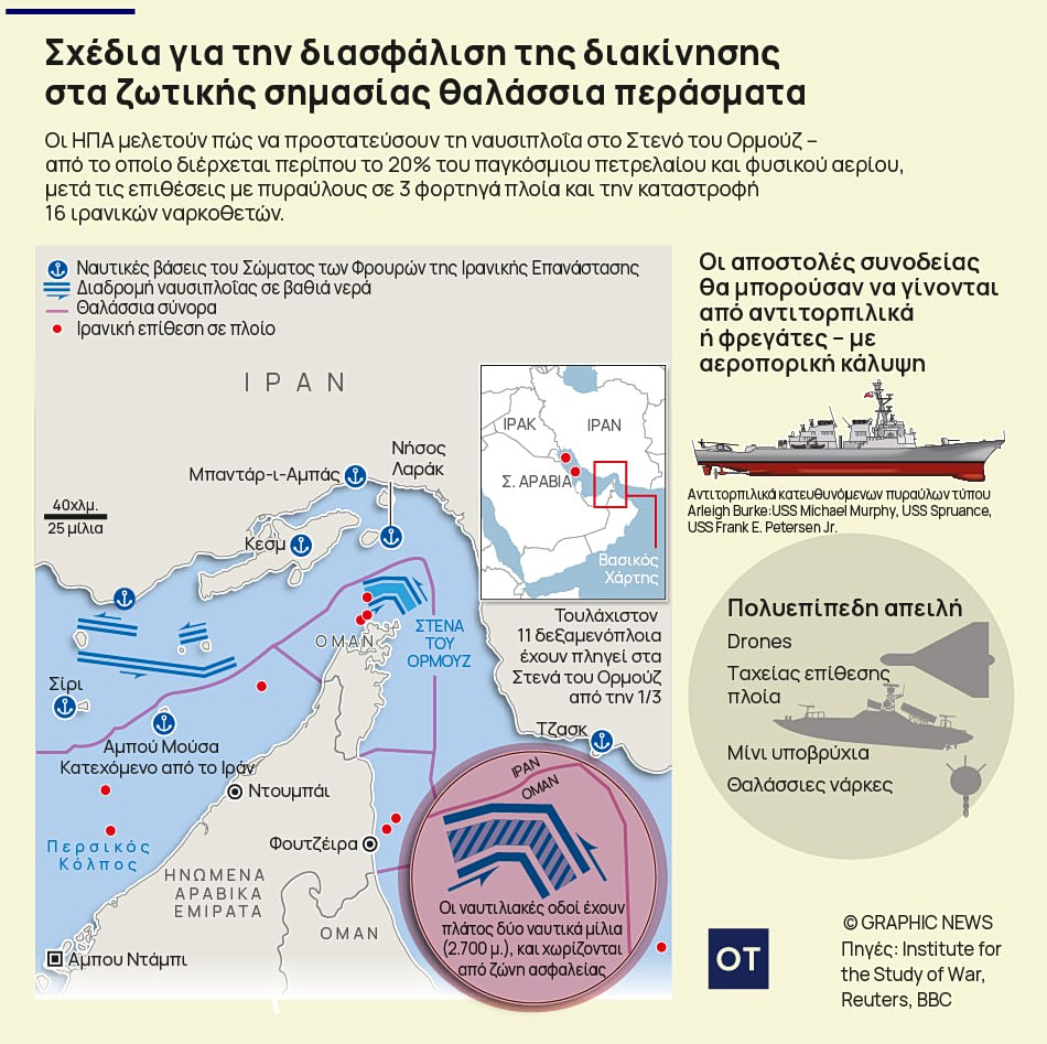 Την ίδια στιγμή οι Ηνωμένες Πολιτειες μιλουν για άνοιγμα των Στενών με τη συνοδεία πολεμικών σκαφών, χωρίς να μπαίνουν σε λεπτομέρειες – επι του παρόντος. Οι αποστολές συνοδείας θα μπορουσαν να γίνουν απο αντιτορπιλικά και φρεγάτες με την απαραίτητη αεροπορική κάλυψη…