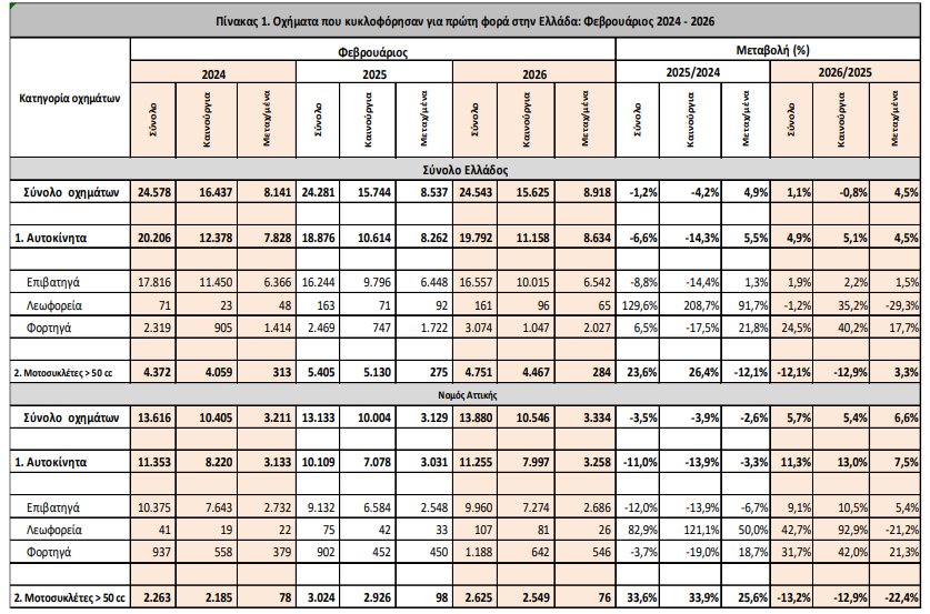 Σε 19.792 ανέρχεται ο αριθμός των αυτοκινήτων (καινούργια και μεταχειρισμένα) που κυκλοφόρησαν για πρώτη φορά τον Φεβρουάριο του 2026, έναντι 18.876 που είχαν κυκλοφορήσει τον αντίστοιχο μήνα πέρυσι, σημειώνοντας αύξηση 4,9%, σύμφωνα με τα στοιχεία της ΕΛΣΤΑΤ.