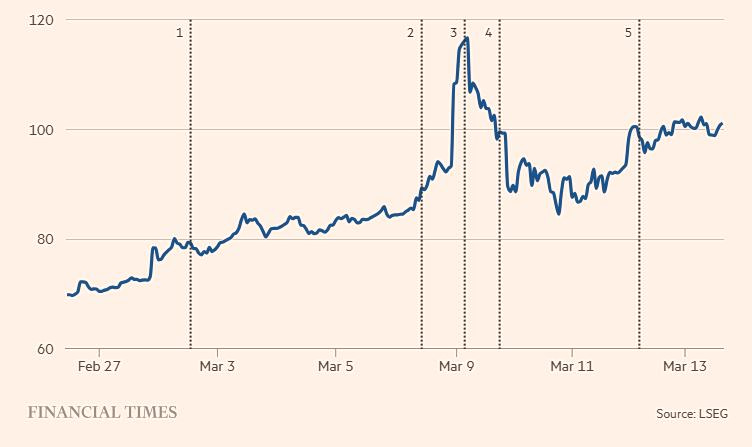 Την Κυριακή το βράδυ, Αμερικανοί αξιωματούχοι υποστήριξαν τη σύγκληση συνάντησης των υπουργών Οικονομικών της G7 για την επόμενη μέρα το πρωί, με σκοπό τη συζήτηση της έκτακτης αποδέσμευσης αποθεμάτων πετρελαίου, μια κίνηση για την οποία ο Λευκός Οίκος είχε επανειλημμένα επιμείνει την προηγούμενη εβδομάδα ότι δεν ήταν υπό συζήτηση. Ένα δημοσίευμα των FT σχετικά με αυτή την αλλαγή στάσης συνέβαλε στην ηρεμία της αγοράς, όπως και οι δηλώσεις του Τραμπ ότι ο πόλεμος πλησιάζει στο τέλος του.