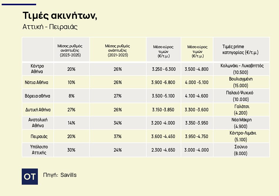 Παράλληλα, οι διαφοροποιήσεις ανά περιοχές είναι εμφανείς. Ειδικότερα, στον Πειραιά μετά από την εκρηκτική άνοδο 37% το 2021-2023, η ανάπτυξη επιβραδύνθηκε στο 20% για 2023-2025, με το ανώτατο όριο των €800.000 του Golden Visa να περιορίζει την υπερβολική ζήτηση. Στα Νότια Προάστια, παρατηρείται επιβράδυνση της ανόδου από 26% σε 10% καθώς οι τιμές υψηλής εισόδου περιορίζουν τη ζήτηση σε εύπορους αγοραστές, στα Βόρεια Προάστια εμφανίζονται σημάδια κόπωσης, αφού οι τιμές πιθανώς έχουν φτάσει το ανώτατο όριό τους.