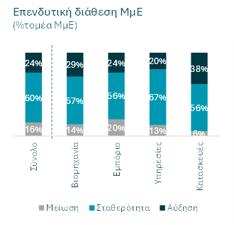 Πριν την εκδήλωση της έντασης στη Μέση Ανατολή, το επενδυτικό κλίμα για τις μικρομεσαίες επιχειρήσεις σημείωνε βελτίωση, με το ¼ του τομέα να επιθυμεί ενίσχυση της επενδυτικής δραστηριότητας σε σχέση με το προηγούμενο εξάμηνο. Συγκεκριμένα, ο κλάδος των κατασκευών ξεχώρισε με το 38% να δηλώνει πρόθεση ενίσχυσης επενδύσεων, έναντι 20-30% στους λοιπούς κλάδους. Η τάση αυτή συμβαδίζει με τη σημαντική βελτίωση των προσδοκιών ζήτησης στις κατασκευές, με τον σχετικό δείκτη εμπιστοσύνης να αυξάνεται κατά 21 μονάδες το δεύτερο εξάμηνο του 2025, έναντι μόλις 1 μονάδας για το σύνολο του τομέα.