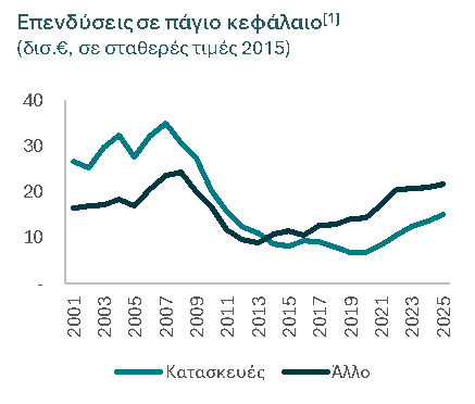 Η σημαντικά υψηλότερη επενδυτική διάθεση στον κλάδο των κατασκευών, έναν κλάδο με κομβική σημασία για την οικονομία, αντανακλά σε μεγάλο βαθμό την προσπάθεια ανάκαμψης μετά από μια μακρά περίοδο χαμηλής δραστηριότητας λόγω της οικονομικής κρίσης. Την τελευταία πενταετία καταγράφεται αισθητή αύξηση της ζήτησης για κατασκευές, όπως επιβεβαιώνεται από πληθώρα δεικτών. Συγκεκριμένα, για την περίοδο 2019-2025: