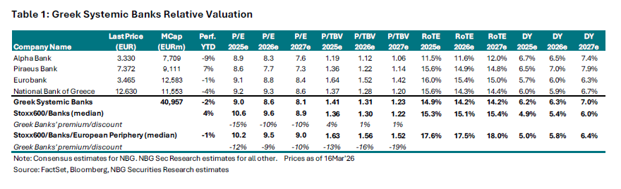 Με ισχυρή κεφαλαιακή επάρκεια, βελτιωμένη ποιότητα ενεργητικού και γενναιόδωρες μερισματικές πολιτικές, ο κλάδος εισέρχεται στο 2026 με αισιοδοξία, παρά τις γεωπολιτικές προκλήσεις, προσθέτει η NBG Securities.