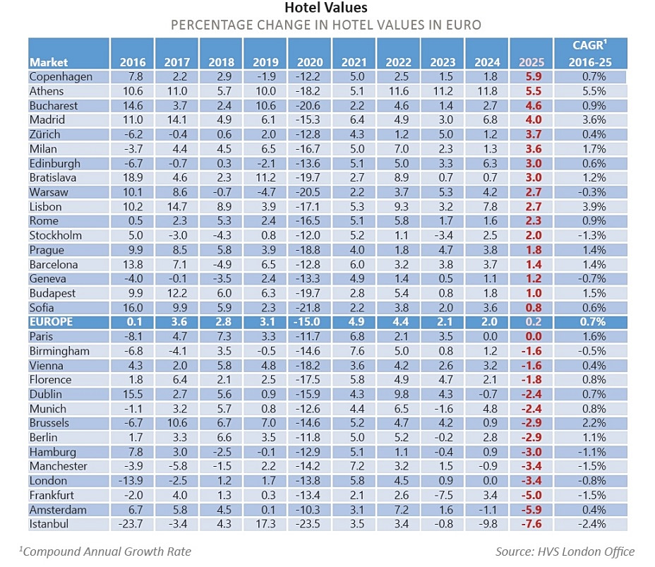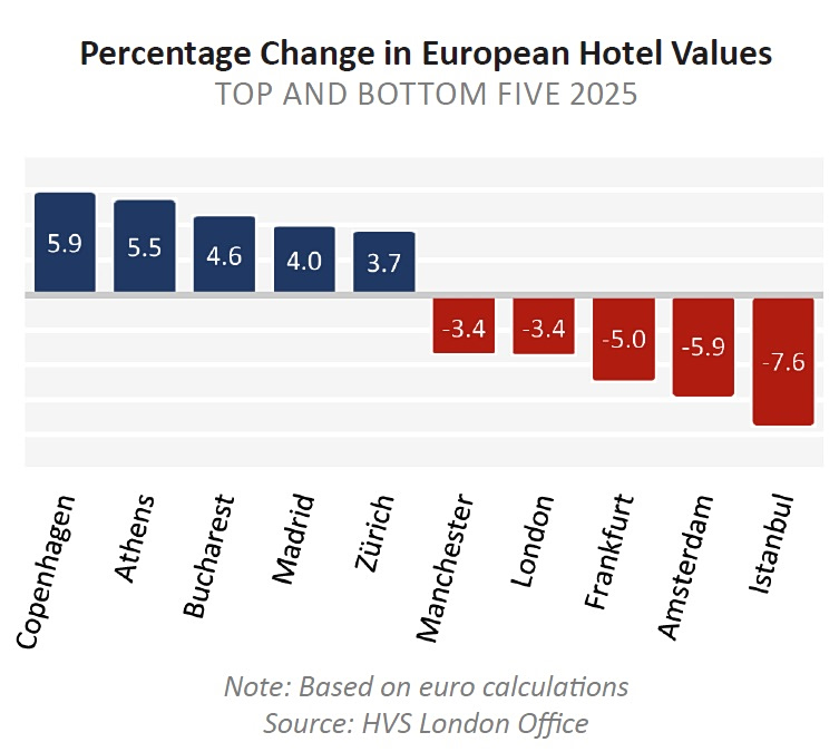 Σε ευρωπαϊκό επίπεδο, το 2025 χαρακτηρίστηκε από συνολικά σταθεροποιημένες αξίες ξενοδοχειακών ακινήτων, με οριακή αύξηση μόλις 0,2%. Ωστόσο, υπήρξαν σημαντικές διαφοροποιήσεις μεταξύ των επιμέρους αγορών, τονίζει η HVS και ξεχωρίζει την Κοπεγχάγη, την Αθήνα, το Βουκουρέστι και τη Μαδρίτη παρουσίασαν ισχυρή ανάπτυξη, κυρίως λόγω της υψηλής ζήτησης και της περιορισμένης νέας προσφοράς. Αντίθετα, αγορές όπως η Κωνσταντινούπολη, το Άμστερνταμ και η Φρανκφούρτη αντιμετώπισαν προκλήσεις που σχετίζονται με πολιτική και οικονομική αβεβαιότητα, αυξημένο κόστος λειτουργίας ή την είσοδο νέων ξενοδοχειακών μονάδων στην αγορά.