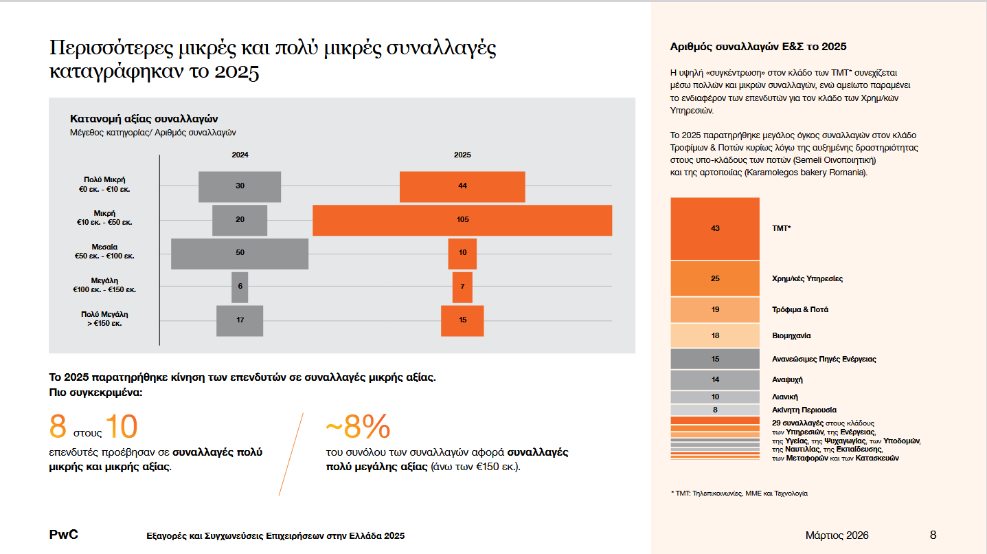 Ένα ακόμη στοιχείο που ξεχωρίζει είναι η ενίσχυση των μικρομεσαίων συναλλαγών, αλλά και η σταδιακή εμφάνιση μεγαλύτερων deals. Όπως σημειώνει ο Γιώργος Μακρυπίδης, Head of Deals της PwC Ελλάδας, «βλέπουμε όλο και περισσότερο τους μεγάλους να εξαγοράζουν μικρότερους παίκτες, με στόχο τη δημιουργία εθνικών πρωταθλητών».