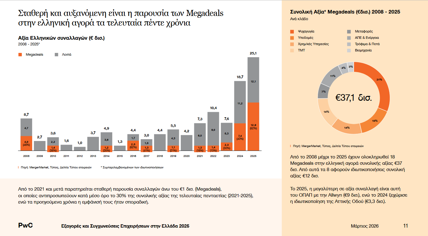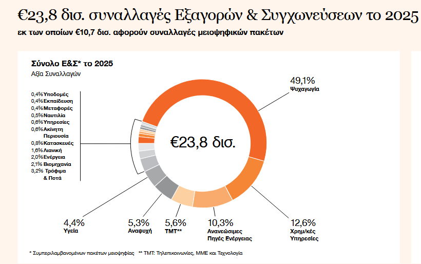 Για το 2026, η PwC βλέπει συνέχεια της κινητικότητας, με ήδη συμφωνημένες ή υπό διαμόρφωση συναλλαγές άνω των 7 δισ. ευρώ