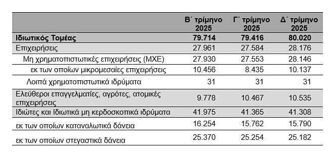 Η ονομαστική αξία των υπό διαχείριση δανείων προς ελεύθερους επαγγελματίες, αγρότες και ατομικές επιχειρήσεις αυξήθηκε κατά 68 εκατ. ευρώ έναντι του προηγούμενου τριμήνου και διαμορφώθηκε σε 10.535 εκατ. ευρώ στο τέλος του δ΄ τριμήνου του 2025.