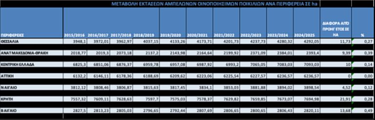 Αντίστοιχα θα πρέπει να διερευνηθεί και να αιτιολογηθεί, ανάλογα η σύγκριση μεταξύ των εκτάσεων που απογράφονται με ποικιλίες για παραγωγή οίνων χωρίς Γεωγραφική Ένδειξη καθώς και Ποικιλιακών Οίνων, των οποίων η αθροισμένη έκταση ανέρχεται σε ποσοστό 15,50% επί του συνόλου του ελληνικού αμπελώνα, ενώ η αντίστοιχη οινοπαραγωγή των κατηγοριών αυτών αντιστοιχεί σε 66,47% του συνόλου της οινοπαραγωγής το 2025.