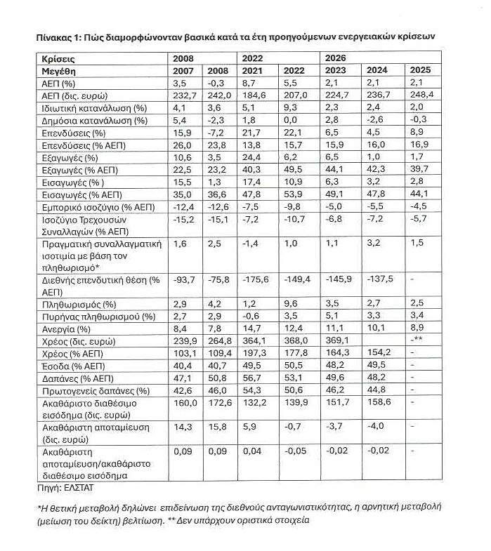 Και η απαισιόδοξη αυτή πρόβλεψη για το αύριο της ελληνικής οικονομίας εδράζεται πάλι σε επίσημα στοιχεία, τα οποία συγκέντρωσα και παρουσιάζω επεξεργασμένα στους δύο νέους παρατιθέμενους πίνακες. Από την εξέταση των στοιχείων και των πινάκων αυτών προκύπτει η γενική διαπίστωση ότι και οι δύο προηγούμενες ενεργειακές κρίσεις βρήκαν την ελληνική οικονομία ευάλωτη, καθώς κυκλωνόταν και κυκλώνεται από τις ίδιες διαρθρωτικές ανισορροπίες και αδυναμίες.