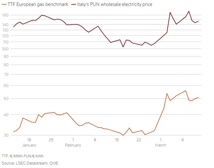 Το ενεργειακό σύστημα της Ιταλίας, σε αντίθεση με εκείνα άλλων χωρών όπως η Γαλλία και η Ισπανία, βασίζεται σε μεγάλο βαθμό στην παραγωγή ηλεκτρικής ενέργειας από φυσικό αέριο, πράγμα που σημαίνει ότι κάθε απότομη αύξηση στις τιμές του φυσικού αερίου μεταφέρεται άμεσα στους λογαριασμούς ηλεκτρικού ρεύματος των επιχειρήσεων και των νοικοκυριών.