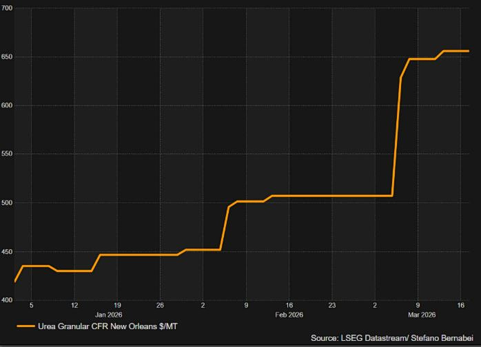 Η τιμή της ουρίας με βάση το άζωτο, ενός από τα πιο ευρέως χρησιμοποιούμενα λιπάσματα στον κόσμο, έχει εκτοξευθεί στα ύψη μετά την εκδήλωση της επίθεσης κατά του Ιράν.