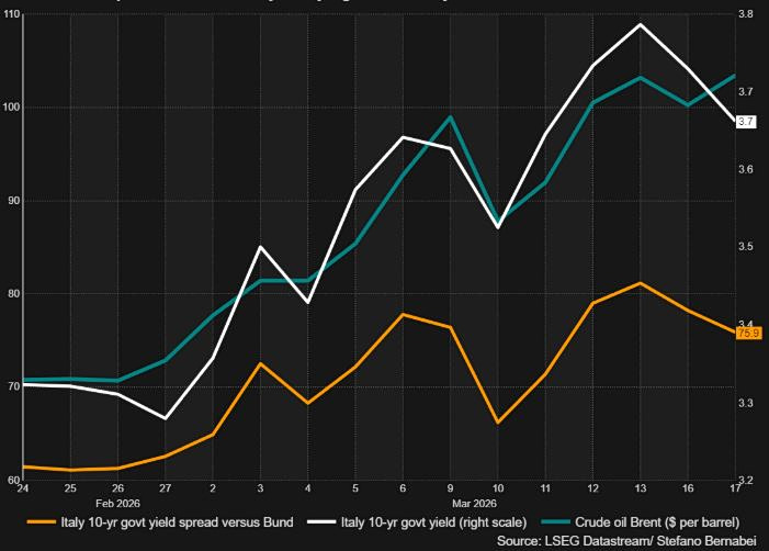 Το ακόλουθο διάγραμμα συγκεντρώνει τρεις μεταβλητές: τις τιμές του πετρελαίου, την απόδοση των 10ετών BTP και το spread BTP-Bund (ιταλικών – γερμανικών ομολόγων). Η Ιταλία, με το τεράστιο δημόσιο χρέος της, τείνει να πλήττεται περισσότερο από άλλες χώρες της ευρωζώνης όταν οι αγορές μεταβαίνουν σε κατάσταση αποφυγής κινδύνου σε περιόδους παγκόσμιας αστάθειας ή όταν οι αγορές φοβούνται υψηλότερα επιτόκια.