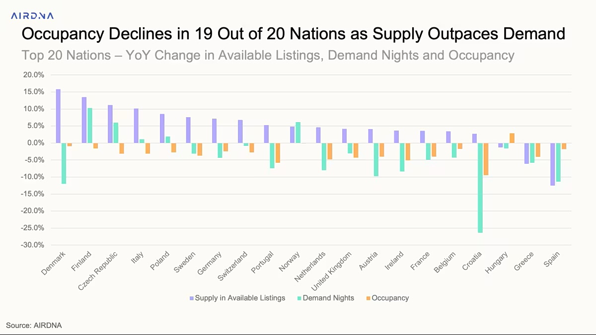 Η Ελλάδα συγκαταλέγεται ανάμεσα στις λίγες μεγάλες ευρωπαϊκές αγορές που παρουσίασαν μείωση στην προσφορά στα καταλύματα τύπου AirBnB, με τις διαθέσιμες καταχωρήσεις να μειώνονται κατά 6% σε ετήσια βάση, αναφέρει η AirDNA.