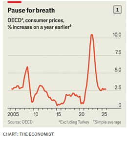 Εχοντας φτάσει πάνω από 10% στα τέλη του 2022, λόγω των εμπλοκών στις εφοδιαστικές αλυσίδες μετά την πανδημία, των υπερβολικά γενναιόδωρων επιδομάτων τόνωσης των οικονομιών και του ενεργειακού σοκ που προκάλεσε ο πόλεμος στην Ουκρανία, ο μέσος πληθωρισμός στις πλούσιες χώρες μειώθηκε. Στις αρχές του 2026 ήταν κοντά στο 2% και οι κεντρικοί τραπεζίτες πίστευαν ότι είχαν… εξοντώσει το τέρας του πληθωρισμού.