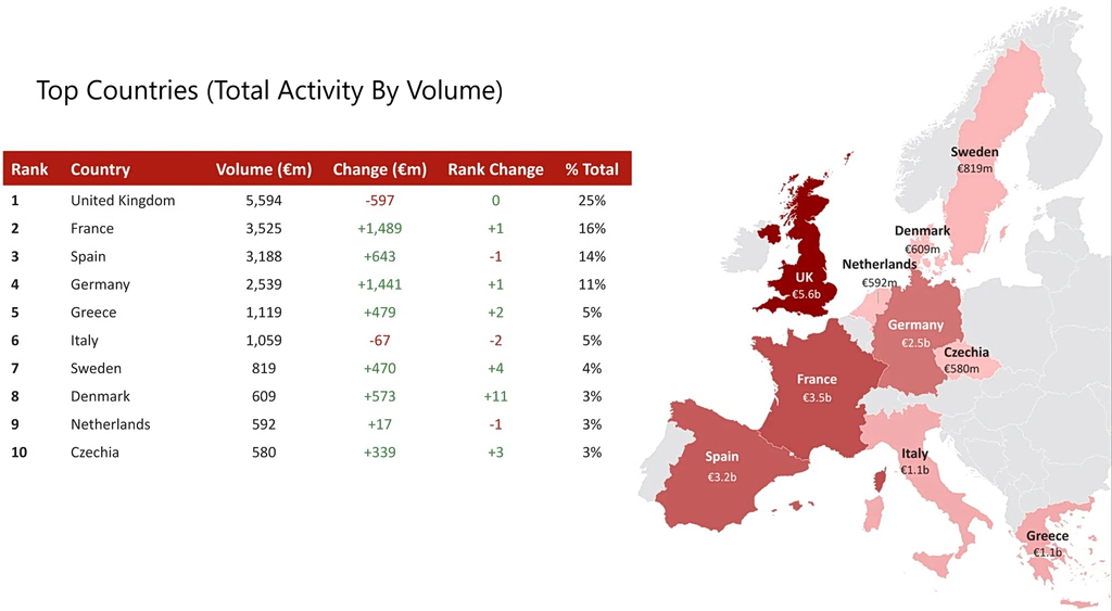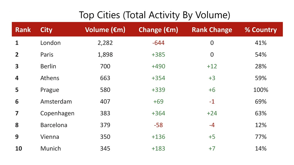 Ακόμη πιο εντυπωσιακή είναι η επίδοση της Αθήνας, η οποία καταλαμβάνει την τέταρτη θέση στο σύνολο των συναλλαγών με 663 εκατ. ευρώ, ανεβαίνοντας τρεις θέσεις σε σχέση με το 2024.