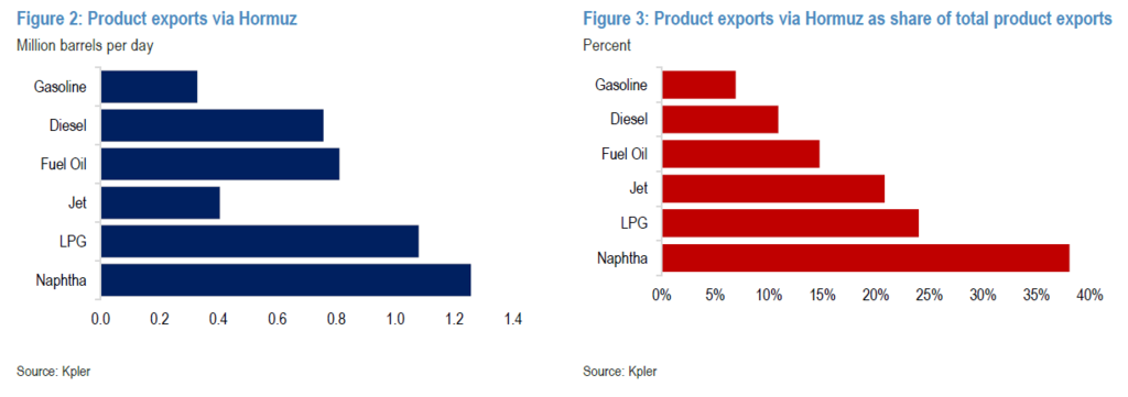 Η διαταραχή στις ροές της Μέσης Ανατολής έχει ήδη οδηγήσει σε ελλείψεις αργού και προϊόντων στην Ασία, ιδιαίτερα στη Νοτιοανατολική Ασία. Χώρες όπως η Ινδονησία, η Ταϊβάν, η Ταϊλάνδη, η Σρι Λάνκα και άλλες αναμένεται να αντλήσουν από τα εμπορικά τους αποθέματα, περίπου 129 εκατ. βαρέλια, προσθέτοντας έως και 1 εκατ. βαρέλια ημερησίως για ορισμένους μήνες.