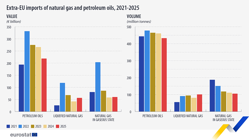 Eνεργειακά προϊόντα αξίας 336,7 δισ. ευρώ, που αντιστοιχούν σε 723,3 εκατομμύρια τόνους, εισήγαγε η ΕΕ το 2025, καταγράφοντας μείωση τόσο σε αξία (-11,1 %) όσο και σε καθαρό βάρος (-0,6 %), σύμφωνα με τα στοιχεία της ευρωπαϊκής στατιστικής υπηρεσίας, Eurostat.
