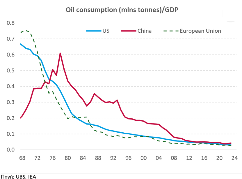 Ωστόσο, όπως παρατηρούσε ο οικονομολόγος Arend Kapteyn της UBS, η ένταση του πετρελαίου στο παγκόσμιο ΑΕΠ, δηλαδή η κατανάλωση πετρελαίου (σε εκατομμύρια τόνους) σε σχέση με το ΑΕΠ (σε δισεκατομμύρια δολάρια) για τις ΗΠΑ, την Κίνα και την ΕΕ, έχει μειωθεί κατά 15–20 φορές από τη δεκαετία του 1970.