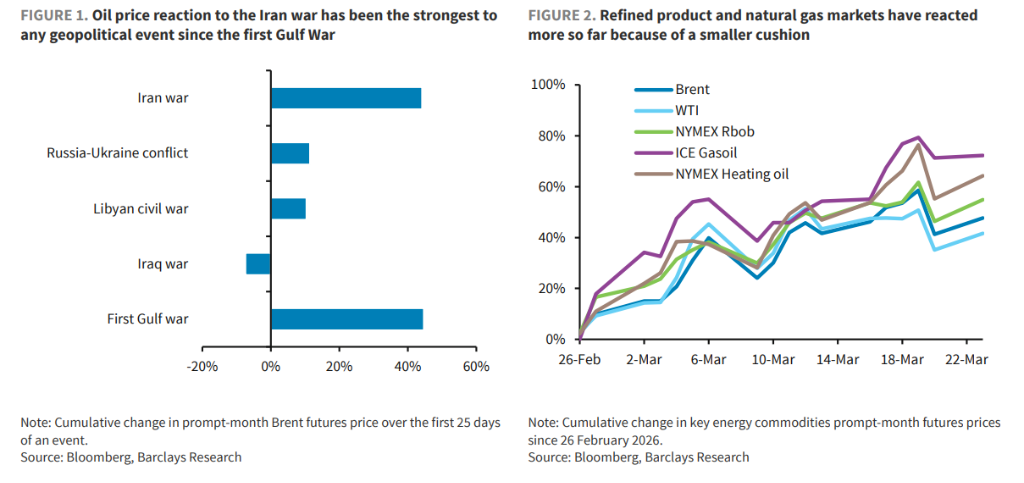 Σύμφωνα με τη Barclays, ο πόλεμος στο Ιράν συνιστά το ισχυρότερο γεωπολιτικό σοκ στις ενεργειακές αγορές από τον Πόλεμο του Κόλπου το 1990. Από την έναρξη των συγκρούσεων στις 28 Φεβρουαρίου 2026, το πετρέλαιο Brent έχει ενισχυθεί κατά 44% μέσα σε μόλις 25 ημέρες, ενώ οι τιμές χονδρικής της βενζίνης στις ΗΠΑ αυξήθηκαν κατά 48%, το ντίζελ στις ΗΠΑ κατά 51% και στην Ευρώπη κατά 58%.