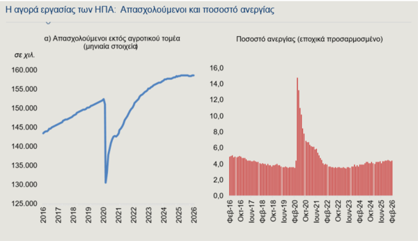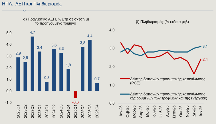 Όπως αναφέρεται σε ανάλυση της Alpha Bank για την αμερικάνικη οικονομία, με τις τιμές του πετρελαίου να ξεπερνούν τα 100 $ το βαρέλι και τις συγκρούσεις να συνεχίζονται, οι κίνδυνοι αυξάνονται. Τούτο αντανακλάται στην ανοδική πορεία των τιμών που επιβαρύνει τα νοικοκυριά. Στο σενάριο ενός παρατεταμένου περιορισμού διέλευσης από τα Στενά του Ορμούζ, η κατάσταση δύναται να επιδεινωθεί περαιτέρω.