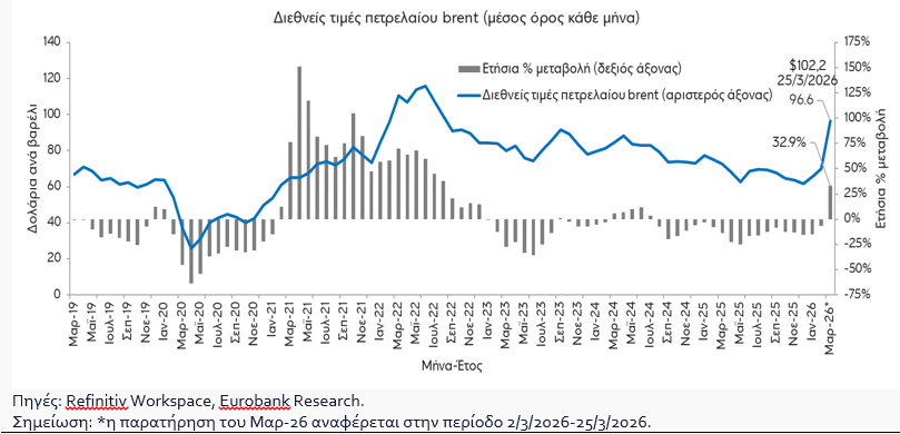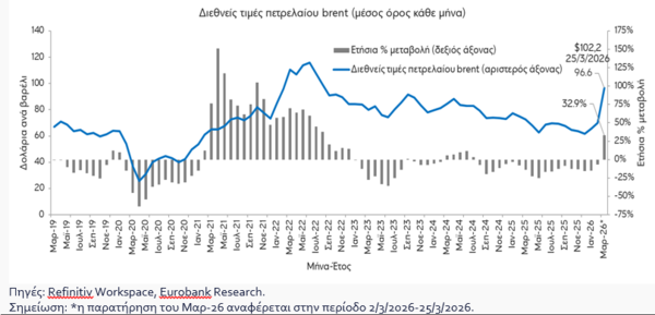 Η αύξηση των τιμών της ενέργειας -στην περίπτωση που δεν αποδειχθεί βραχύβια η σύγκρουση στη Μέση Ανατολή- δύναται να δημιουργήσει δυνάμεις επιβράδυνσης του ρυθμού μεγέθυνσης, επιτάχυνσης του πληθωρισμού και επιδείνωσης του ελλείμματος τρεχουσών συναλλαγών, δεδομένης της υψηλής εξάρτησης της ελληνικής οικονομίας από εισαγόμενα ορυκτά, αναφέρει η Eurobank στην έκθεσή της «7 ημέρες οικονομία».