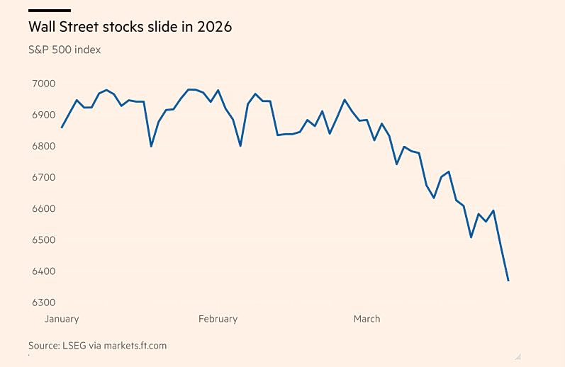 Ο S&P 500, έχει υποχωρήσει κατά περίπου 7,4% από την έναρξη του πολέμου και οδεύει προς τη μεγαλύτερη μηνιαία πτώση του από τον Σεπτέμβριο του 2022.