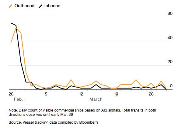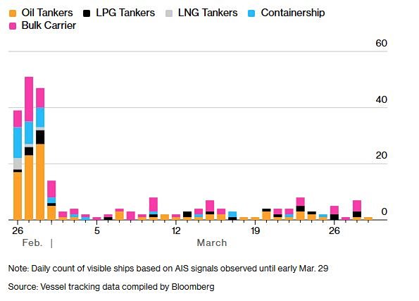 Τα δεξαμενόπλοια μεταφοράς αργού πετρελαίου που συνδέονται με το Ιράν συνεχίζουν να διασχίζουν τα Στενά του Ορμούζ με τους πομποδέκτες τους απενεργοποιημένους, με τη ροή να ανέρχεται κατά μέσο όρο σε περίπου 1,6 εκατομμύρια βαρέλια την ημέρα κατά τις πρώτες 23 ημέρες του Μαρτίου, σύμφωνα με το Tankertrackers.com.