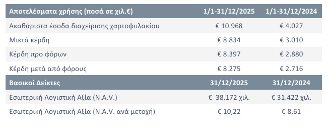 Στα 8,27 εκατ. ευρώ ανήλθαν τα κέρδη μετα φόρων της Alpha Trust Ανδρομέδα για το 2025 έναντι 2,72 εκατ. ευρω το προηγουμενο έτος (2004), παρουσιάζοντας σημαντική άνοδο κατα 205%.