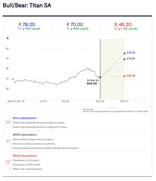 Ισχυρή δυναμική και θετικές προοπτικές για το 2026 «βλέπει» για την Τιτάν η Citigroup, διατυπώνοντας σύσταση «αγοράς» με τιμή στόχο τα 70 ευρώ (78,20 ευρώ στο θετικό σενάριο και 46,20 ευρώ στο αρνητικό). Σύμφωνα με τις εκτιμήσεις/προβλέψεις της αμερικανικής επενδυτικής τράπεζας οι πωλήσεις της εταιρείας αναμένεται να διαμορφωθούν στα 2,83 δις. το 2026 και στα 2,97 δις. το 2027 έναντι των 2,66 δις. στη χρήση του 2025 με τα καθαρά κέρδη να εκτιμώνται στα 325,5 εκατ. ευρώ και στα 362,4 εκατ. ευρώ έναντι 236,3 εκατ. ευρώ αντίστοιχα.