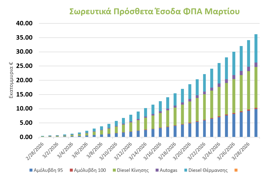 Ειδικότερα, τα σωρευτικά πρόσθετα έσοδα ΦΠΑ από τα καύσιμα στις 8 Μαρτίου ήταν λίγο πάνω από 5 εκατ. ευρώ, στις 26 του μήνα άγγιξαν τα 34 εκατ. ευρώ, ενώ για το σύνολο του Μαρτίου σύμφωνα με εκτίμηση ξεπέρασαν τα 36 εκατ. ευρώ.
