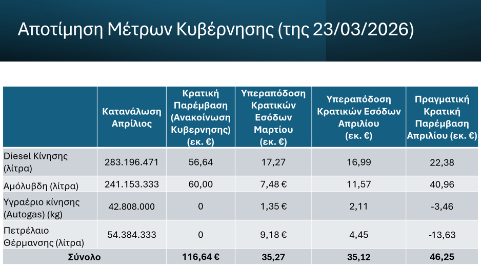 Παράλληλα, η συνολική παρέμβαση της κυβέρνησης για τον μήνα Απρίλιο ανέρχεται σε 116 εκατ. ευρώ, όμως την ίδια περίοδο καταγράφει αυξημένα έσοδα από τον ΦΠΑ, λόγω της σημαντικής ανόδου των τιμών, και με βάση τα έως τώρα διαθέσιμα στοιχεία τα εν λόγω πρόσθετα έσοδα ξεπερνούν τα 70 εκατ. ευρώ. Ως εκ τούτου η καθαρή δημοσιονομική παρέμβαση δεν ανέρχεται σε 116 εκατ. ευρώ αλλά περιορίζεται σε περίπου 46 εκατ. ευρώ.