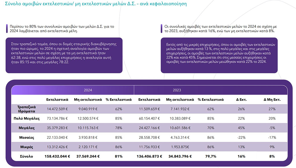 Περίπου το 81% των συνολικών αμοιβών του 2024 λαμβάνεται από εκτελεστικά µέλη Δ.Σ. Στον τραπεζικό τομέα, το 2024 η σχετική αναλογία αμοιβών εκτελεστικών μελών σε σχέση με μη εκτελεστικά ήταν 62:38.