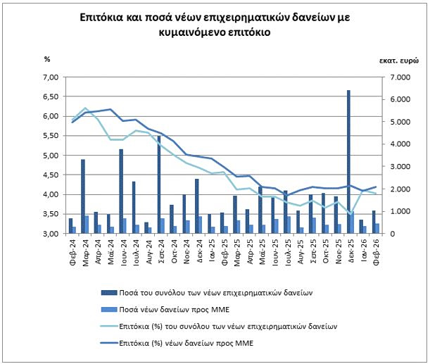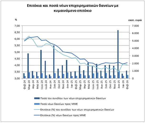 Τον Φεβρουάριο του 2026, τα μέσα σταθμισμένα επιτόκια του συνόλου των υφιστάμενων καταθέσεων και δανείων παρέμειναν σχεδόν αμετάβλητα στο 0,30% και 4,58% αντίστοιχα.