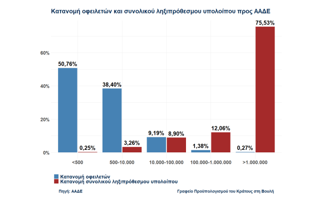 Ειδικότερα, στο εύρος οφειλής άνω του 1 εκατ. ευρώ συγκεντρώνεται το 75,53% του συνολικού ληξιπρόθεσμου υπολοίπου και μόλις το 0,27% των οφειλετών. Αντιθέτως, το 89,16% των οφειλετών συγκεντρώνεται στις οφειλές έως 10.000 ευρώ με το συνολικό τους ληξιπρόθεσμο υπόλοιπο να αγγίζει το 3,52% των συνολικών οφειλών.