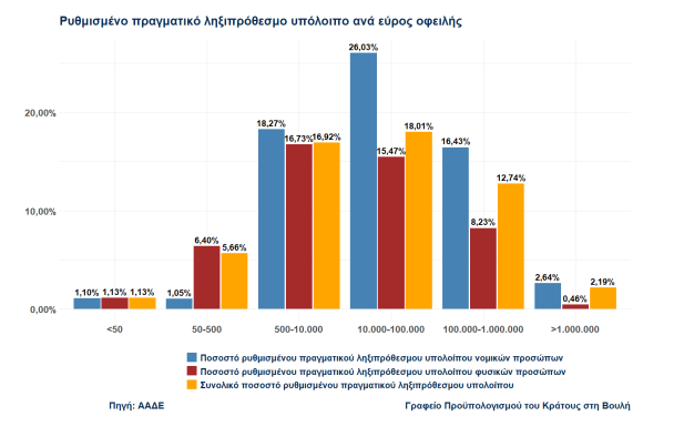 Το υψηλότερο ποσοστό των συνολικών ρυθμισμένων οφειλών (18,01%) εντοπίζεται στο εύρος 10.000 με 100.000 ευρώ, ενώ εντός αυτού