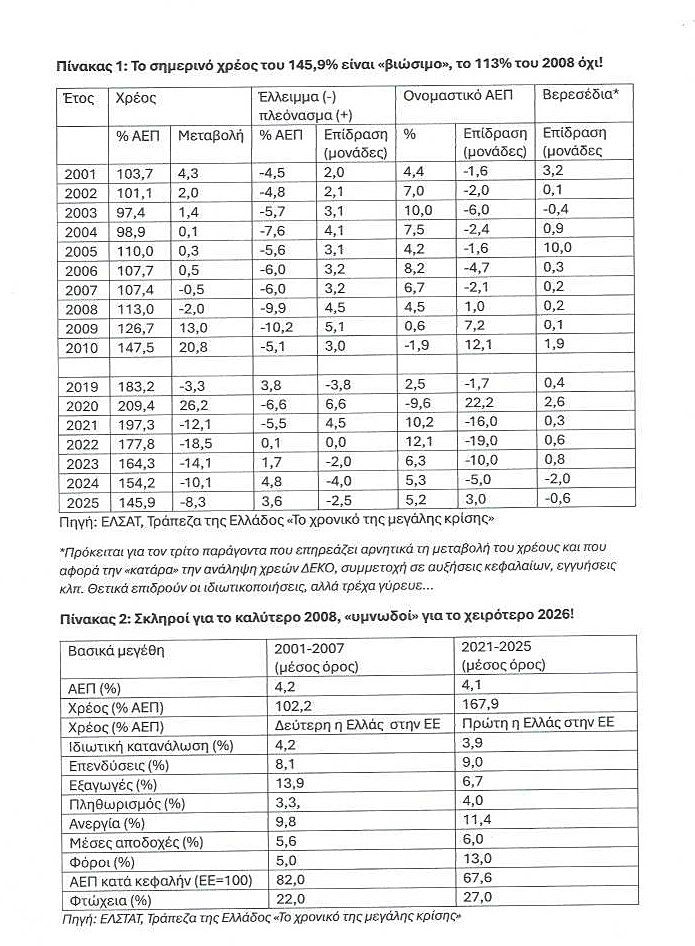 Το πιάσατε το υπονοούμενο; Οι κίνδυνοι για τη βιωσιμότητα του χρέους του 145,9% του ΑΕΠ είναι οριοθετημένοι (ενώ του 103% του ΑΕΠ την επταετία της «ισχυρής ανάπτυξης» του 2000 ή του 113% του ΑΕΠ του πληττόμενου από την κρίση 2008 ή του 126,7% του ΑΕΠ του «επάρατου» 2009 δεν ήταν!), αφού η δημοσιονομική πολιτική παράγει πρωτογενή πλεονάσματα και αποπληρώνονται οι δόσεις των δανείων, αποστρέφοντας το πρόσωπό τους από την αλγεινή πραγματικότητα ότι επισωρεύονται πολλά δεινά στην ελληνική κοινωνία με τον ανελέητο φορομπηχτισμό, την ηθελημένη πληθωριστική ανάπτυξη (με κυρίαρχο υπόβαθρο το παραγωγικό κενό!) και τις επιχειρήσεις και την αγορά με τη μη πληρωμή (σύμφωνα με τη μνημονιακή μάλιστα υποχρέωση!) ληξιπρόθεσμων υποχρεώσεων τριών περίπου δις. ευρώ!