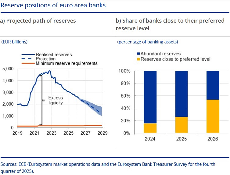 Τα αποθεματικά των κεντρικών τραπεζών έχουν σχεδόν μειωθεί στο μισό, από την κορύφωση των 4,9 τρισ. ευρώ το 2022 σε 2,6 τρισ ευρώ στις αρχές του 2026. Ενώ εξακολουθούν να είναι άφθονα, είναι άνισα κατανεμημένα μεταξύ των τραπεζών. Αυτό υποδηλώνει ότι, καθώς το Ευρωσύστημα συνεχίζει να συρρικνώνει τον ισολογισμό του, ορισμένες τράπεζες ενδέχεται να χρειαστεί να αντλήσουν αποθεματικά νωρίτερα από άλλες.