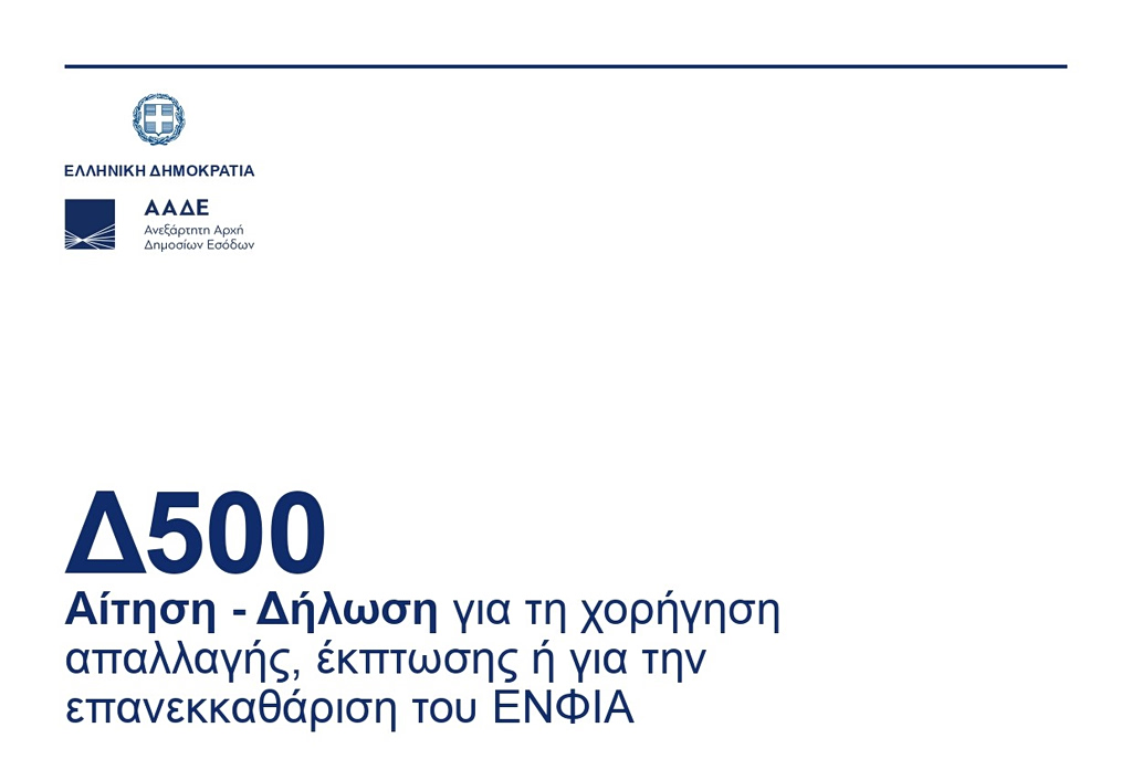Σε περίπτωση απαλλαγής ή μείωσης που δεν χορηγήθηκε με την κεντρική εκκαθάριση του ΕΝΦΙΑ, οι δικαιούχοι μπορούν να υποβάλουν αίτηση ψηφιακά στην αρμόδια υπηρεσία (ΔΟΥ/ΚΕΦΟΚ) μέσω της εφαρμογής Τα Αιτήματά μου στην ψηφιακή πύλη myAADE (myaade.gov.gr), ακολουθώντας τη διαδρομή: Τα Αιτήματά μου > Νέο αίτημα > Φορολογία > Κεφάλαιο > Αίτηση για χορήγηση μείωσης ή απαλλαγής στον ΕΝΦΙΑ. Μαζί με την αίτηση συνυποβάλλεται το έντυπο Δ500 και τα απαιτούμενα κατά περίπτωση δικαιολογητικά.