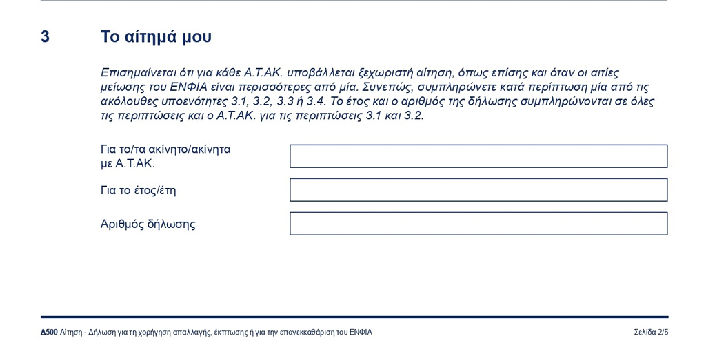Επισημαίνεται ότι για κάθε Α.Τ.ΑΚ. υποβάλλεται ξεχωριστή αίτηση, όπως επίσης και όταν οι αιτίες μείωσης του ΕΝΦΙΑ είναι περισσότερες από μία. Συνεπώς, συμπληρώνετε κατά περίπτωση μία από τις ακόλουθες υποενότητες 3.1, 3.2, 3.3 ή 3.4. Το έτος και ο αριθμός της δήλωσης συμπληρώνονται σε όλες τις περιπτώσεις και ο Α.Τ.ΑΚ. για τις περιπτώσεις 3.1 και 3.2.