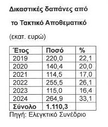Ακόμα, διαπιστώνει διάθεση υψηλού ποσοστού των πιστώσεων του Τακτικού Αποθεματικού στους φορείς της Κεντρικής Διοίκησης για την εκτέλεση δικαστικών αποφάσεων. Συγκεκριμένα, το 2024, για παράδειγμα, από τις πιστώσεις του Τακτικού Αποθεματικού διατέθηκαν 264,94 εκατ. ευρώ ή το … 33,12% για την εκτέλεση δικαστικών αποφάσεων. Το ίδιο είχε παρατηρηθεί και κατά τα έτη 2019, 2020, 2021, 2022 και 2023, που είχαν χορηγηθεί στους φορείς για την ίδια αιτία τα ποσά των 220, 140,45 , 114,54 , 255,52 και 114,99 εκατ. ευρώ, που ανέρχονταν σε ποσοστό 22,14%, 20,08%, 17%, 26,14% και 16,43% αντίστοιχα, των συνολικών πιστώσεων του Τακτικού Αποθεματικού κάθε έτους.